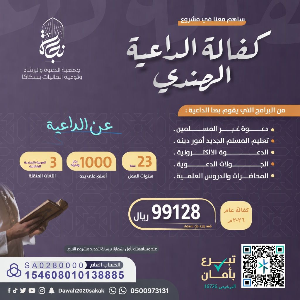 ساهم معنا في كفالة دعاة الجمعية.. من أبرز أعمال الداعية.. دعوة غير المسلمين. تعليم المسلمين الجديد أمور دينه. الدعوة الإلكترونية. الجولات الدعوية والتوعوية. المحاضرات والدروس العلمية.